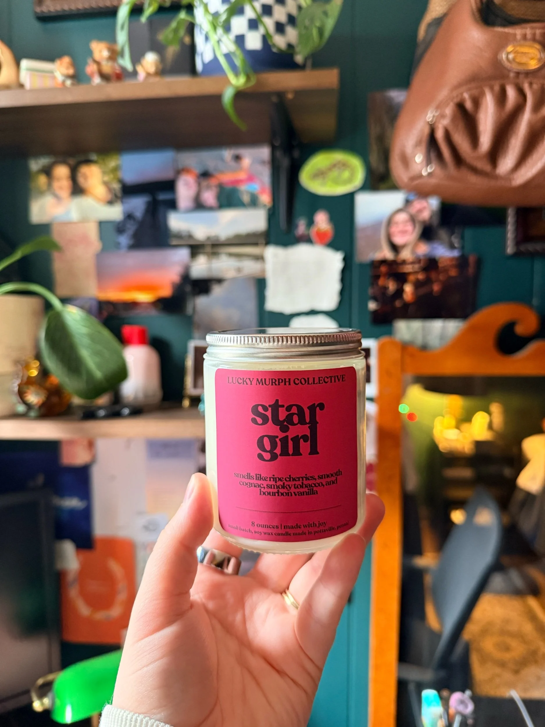 Shop › Star Girl Candle Image 1 of 1 Star Girl Candle $20.00 Smells like like ripe cherries, smooth cognac, smoky tobacco, and bourbon vanilla!8 oz / Soy wax / Made with love Add To Cart Added! Smells like like ripe cherries, smooth cognac, smoky tobacco, and bourbon vanilla!8 oz / Soy wax / Made with love
